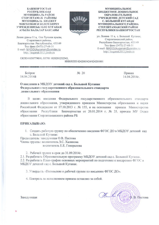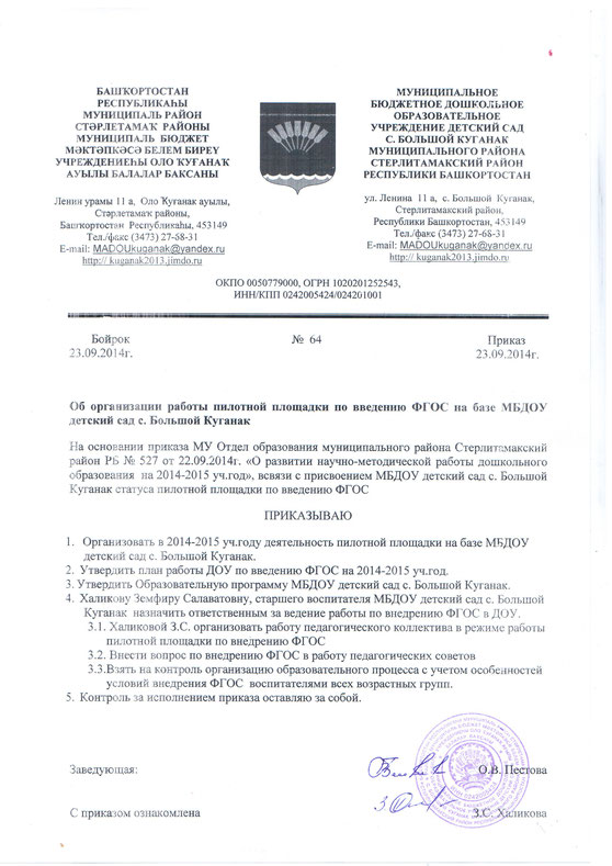 Приказ МУ Отдел Образования МР Стерлитамакский район "О введении в муниципальном районе Стерлитамакский район Федерального государственного образовательного стандарта дошкольного образования"